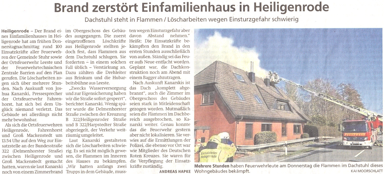 Brand zerstört Einfamilienhaus in Heiligenrode, Dachstuhl steht in Flammen / Löscharbeiten wegen Einsturzgefahr schwierig, Haus Feldmann an der Delmenhorster Straße.