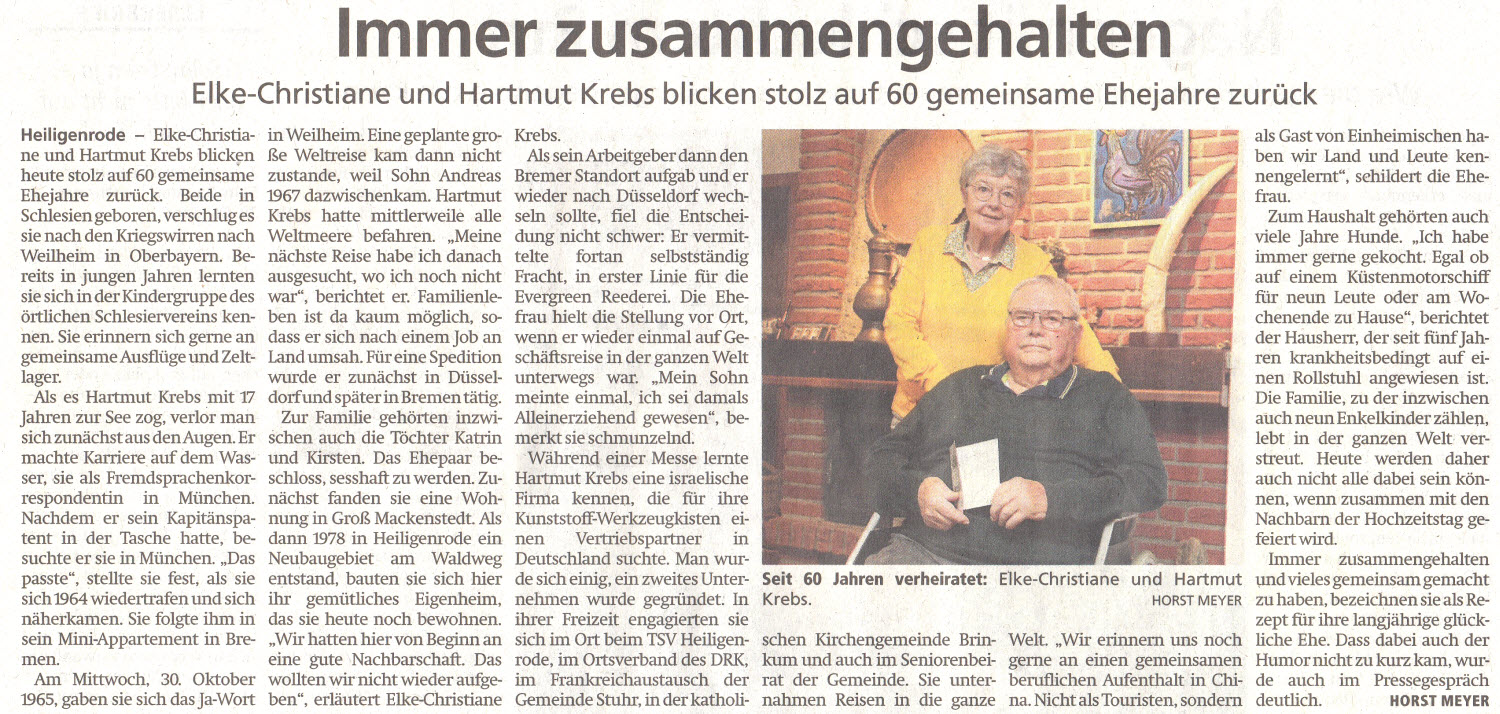 Elke und Hartmut Krebs blicken stolz auf 60 gemeinsame Ehejahre zurück, immer zusammengehalten, ist ihre Rezept. (Quelle Tageszeitungen)