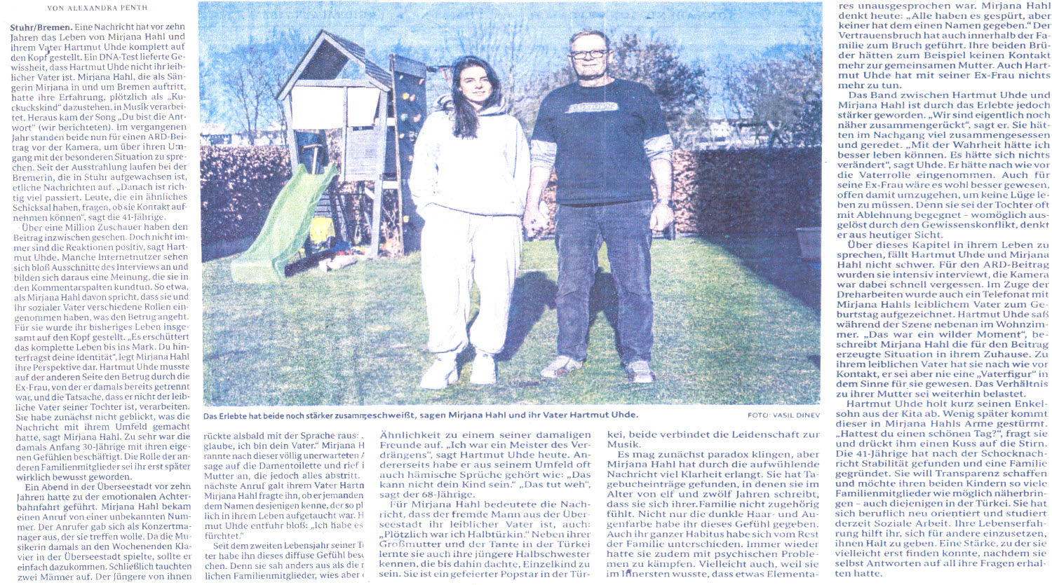 Plötzlich ein Kuckuckskind, die in Stuhr (Heiligenrode) aufgewachsene Mirjana Hahl und ihr Vater Hartmut Uhde sprechen in einem Fernsehbeitrag über ihre besondere Geschichte. (Quelle Tageszeitungen)
